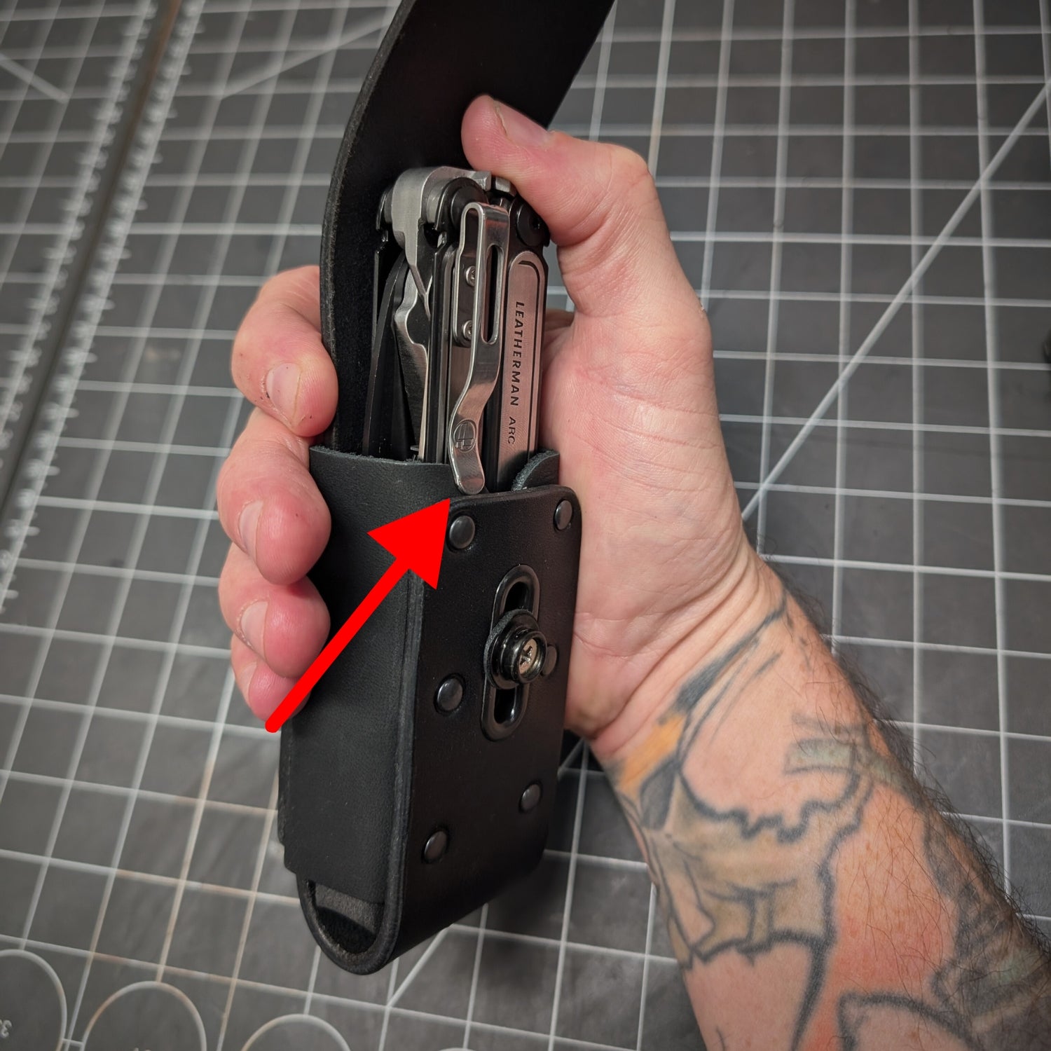 Some factory Multi-Tool clips are not compatible with our holsters and will need to be removed. Here is an example with the Leatherman Arc