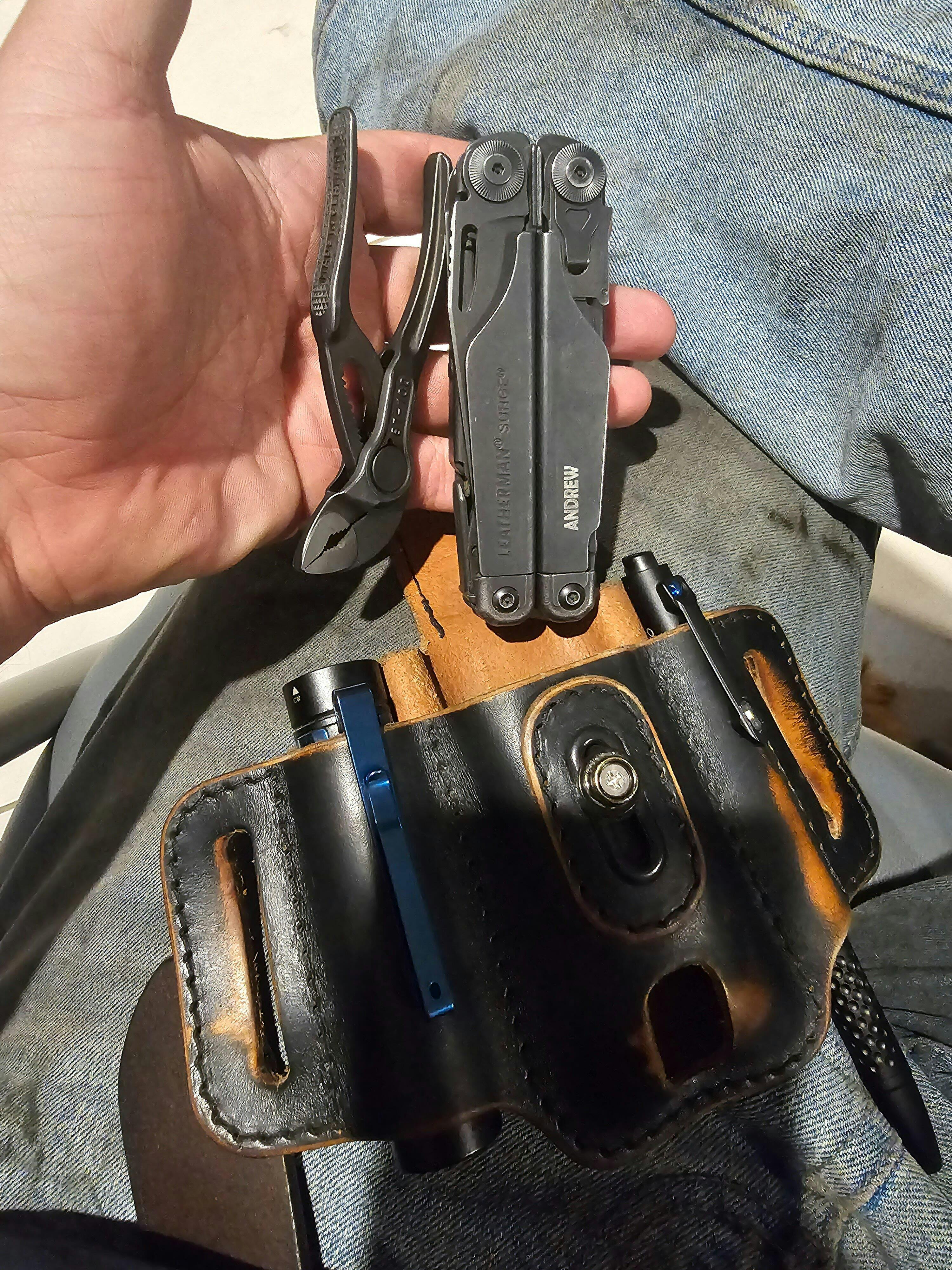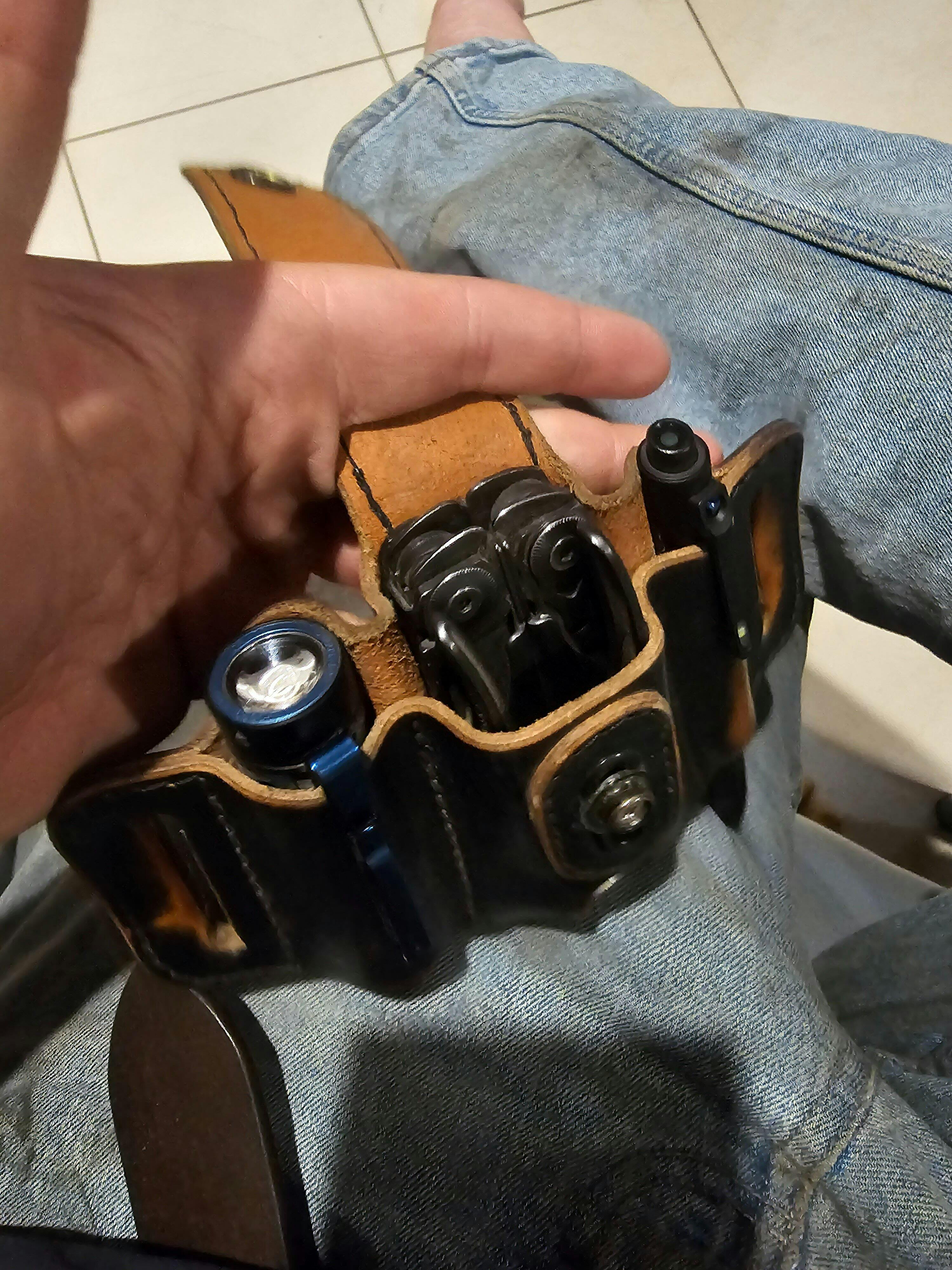 The RMK Compact Trio EDC Pancake Holster with keeper is a heavy duty 3 pocket holster designed for the smaller multi-tools such as the Leatherman Arc, P4, Wave, Charge, Skeletool, Wingman and Sidekick. They are made from strong full grain leathers for quick & easy access to your everyday carry essentials on the big jobs. The new & improved design has a keeper flap and adjustable snap to suit a wider variety of multi-tools.