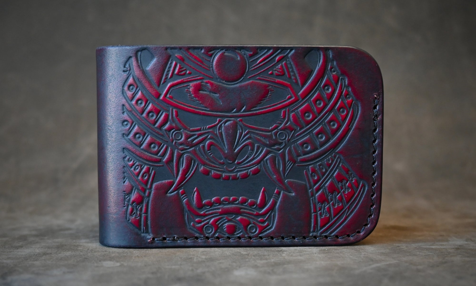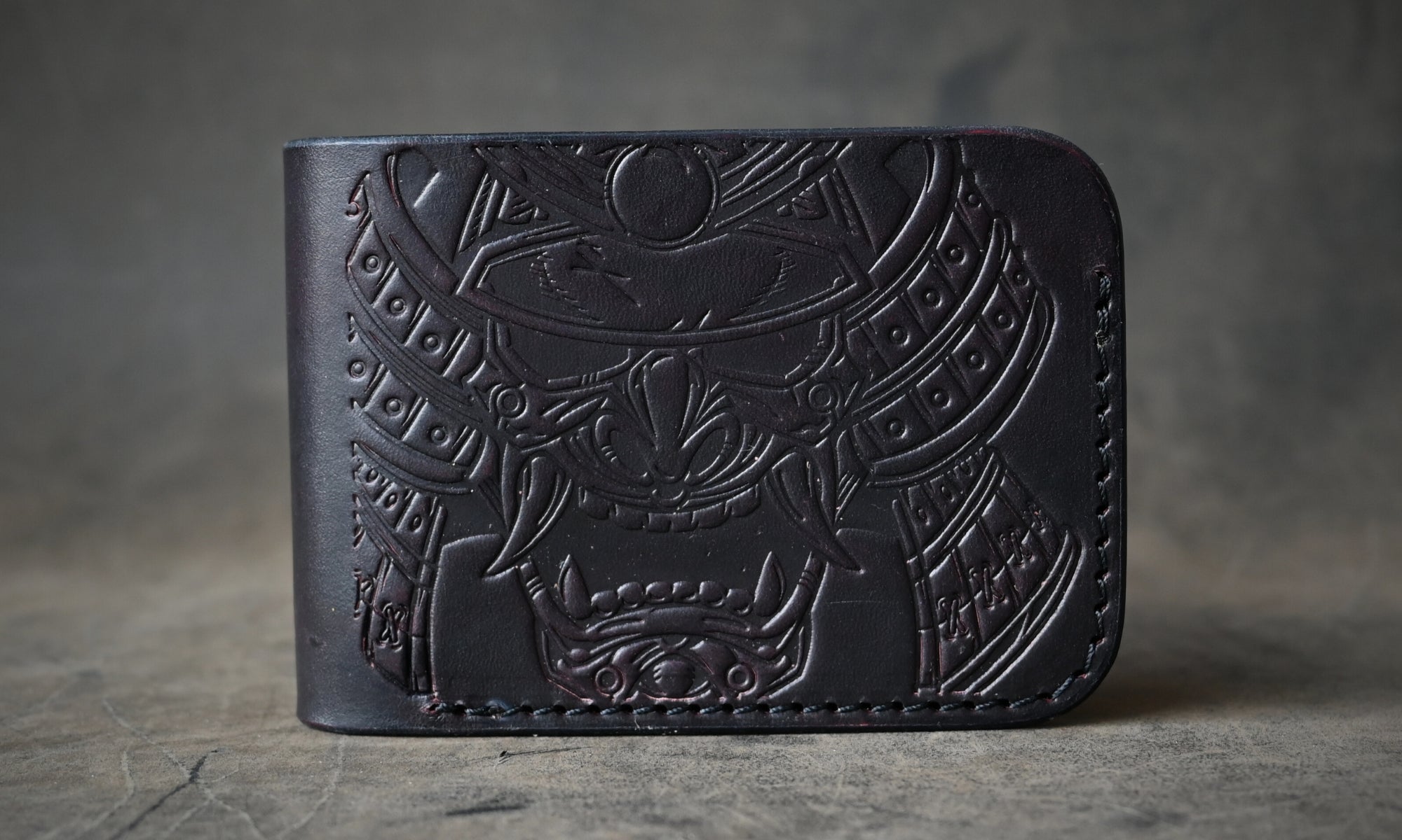 Samurai Mask Themed Bifold Wallet Ghost Leather Saddle Tan